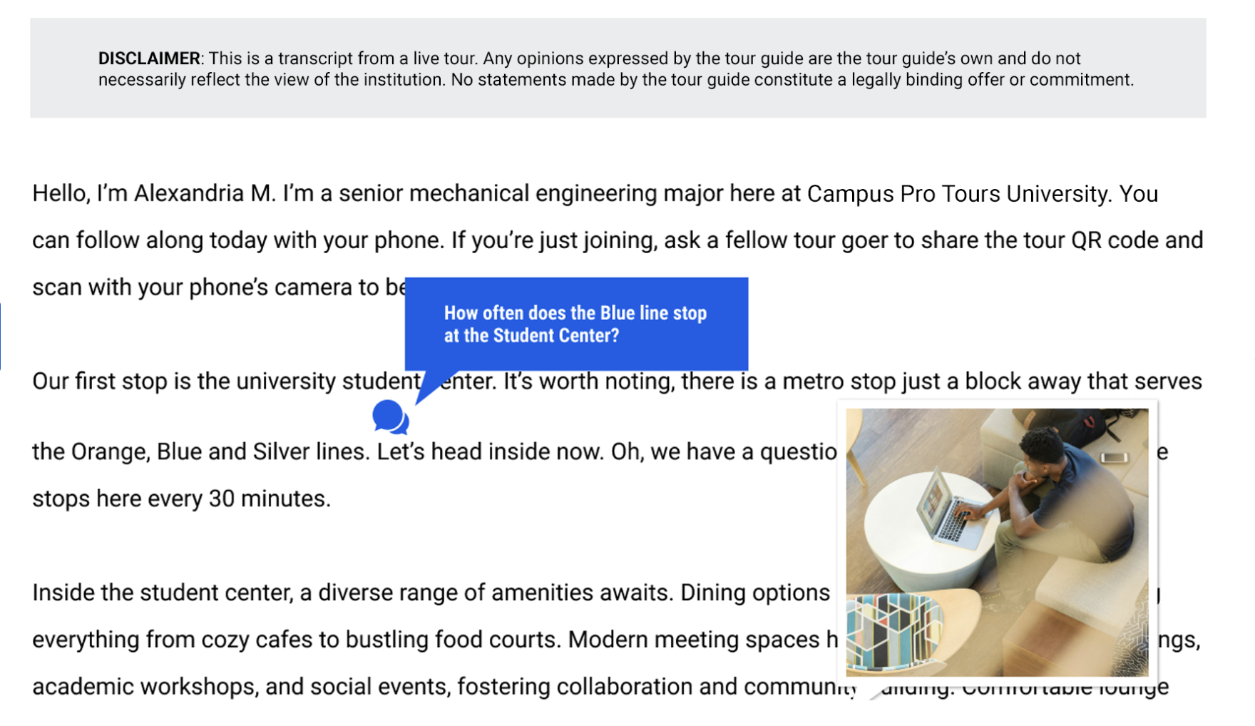 - Interactive post-tour transcript, map, and photo gallery
